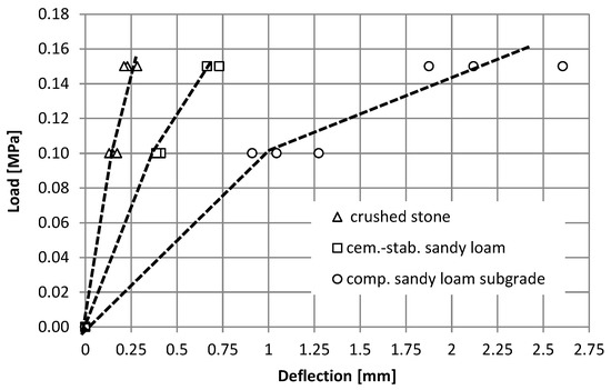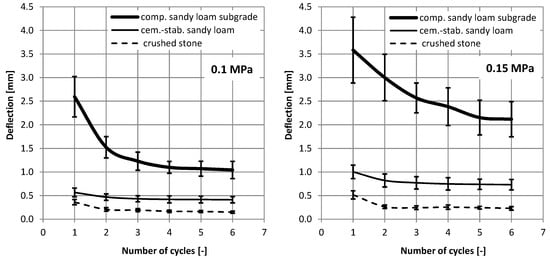 It is clearly visible how important the change of the modulus value may be in relation to the first and the last (sixth) load cycle, for which the registered displacements are already “stabilized”. Both in the case of the crushed stone layer on the cement-stabilized layer and in the case of the compacted native subgrade, the difference between the modules is almost twofold. Most likely, it results from the significant compaction of the material (in the case of stone in system No. 1) and plastic deformation of the material (in the case of sandy loam: No. 3). The smallest changes occur for system No. 2—the cement-stabilized native subgrade. It should also be noted that, for a plate load of 0.15 MPa, lower modulus values were obtained than for a load of 0.1 MPa. In the case of the analysis for the end cycles, the differences amount to, respectively, for the system No. 1, 4%; No. 2; 16%; and No. 3, as much as 35%. Such changes significantly confirm the “non-linear” material properties and indicate the need to correct the target values of modules if they will be tested under a load lower than the actual load that will occur during operation.