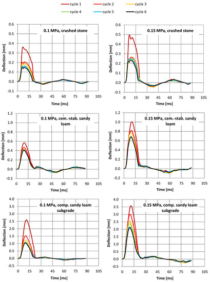 In the case of the compacted native subgrade (structure 3), at the load of 0.15 MPa, the final six discharge displacements obtained over three times greater displacements than for the cement-stabilized layer on the native subgrade (structure 2) and seven times greater than on the crushed stone layer (structure 1). It is worth noting that the obtained displacement values relate to the displacement values at the moment of the maximum load impulse. Figure 3 presents examples of displacement waveforms during the test for all six load cycles.