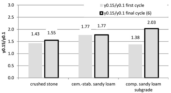Based on the comparison of the ratio of the mean values of displacements for the load of 0.15 MPa and 0.1 MPa (marked as y0.15/y0.1), it was found that sandwich system No. 1 with the crushed aggregate layer is similar to the behavior of the elastic material. The ratio of the displacement values oscillates around the value of 1.5, which corresponds to the ratio of the load values (Figure 4). A clear lack of proportionality of displacements in relation to the load is visible for the compacted native subgrade (sandy loam) for the final test cycle and amounts to 2.03. The value of 1.77 was obtained on the native subgrade, stabilized with cement (system No. 2). The same value was obtained for both the first and the last cycle, which proves the low variability of elastic properties with increasing load cycles. The lack of obtaining exact ratios equal to 1.5 proves the non-linear behavior of these materials (especially the compacted native subgrade) and indicates the need to use load-dependent material characteristics for their description or to use the correction coefficients developed by the authors.