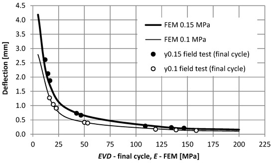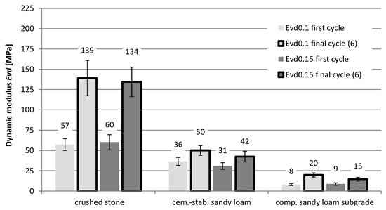 The recorded displacement results were used in the further part of the work to identify the values of dynamic equivalent moduli (Evd) of the examined layer systems. Figure 6 shows the values of dynamic moduli determined for the initial and final load cycles at different load values. The dynamic modulus Evd was calculated on the basis of the measured values of displacements yi, depending on the value of the load σi: