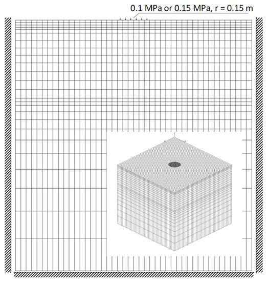 The finite element method (FEM) was used to calculate the value of displacements for different values of material parameters. The model was built with the use of three-dimensional volumetric elements (Figure 9), and the subgrade layers were described for comparison with elastic parameters corresponding to dynamic replacement modules determined in field tests. The load was assumed following the conditions of training tests—as a model of a rigid round plate with a pressure of 0.1 MPa and 0.15 MPa, and a radius of 0.15 m. Full interlayer adhesion was applied in the model.