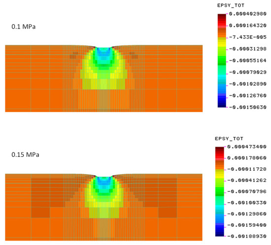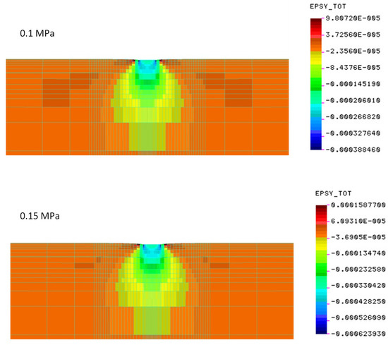 In the description of the elastic material, a wide range of modulus changes from 5 MPa to 200 MPa was analyzed. All analyses were performed for the conditions in the final (sixth), stabilized load cycle. The FEM calculations were conducted for the following moduli obtained in tests: crushed stone on a cement-stabilized subgrade (construction No. 1): 139 MPa (load 0.1 MPa), 134 MPa (load 0.15 MPa); cement-stabilized subgrade (construction No. 2): 50 MPa (load 0.1 MPa), 42 MPa (load 0.15 MPa); native subgrade (construction No. 3): 30 MPa (load 0.1 MPa), 15 MPa (load 0.15 MPa). Poisson’s ratio of 0.35 was used in all cases.