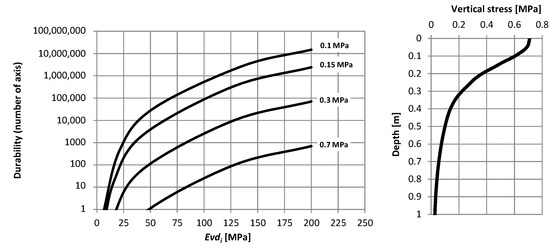 The durability calculations show that the analyzed systems with modules less than 50 MPa may not transfer the required construction or temporary traffic and will be destroyed in the upper part of the layer when in contact with a pressure of 0.7 MPa. At a depth of about 20 cm, the values of vertical stresses will decrease to about 0.3 MPa, which ensures durability at this depth of about 100 axes. Such layers will therefore require partial replacement with new layers. In the case of other, more rigid systems (e.g., with cement-bound layers), a reduction in durability should be taken into account in the comprehensive operation of the final pavement structure, depending on the intensity of technological/temporary traffic. The durability of these layers at different depths will be from 100 to 10,000 axes.