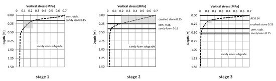 Three stages were considered, which in practice are often made and used during construction with technological (construction) or temporary traffic. Stage 1: subgrade improved from native cement-stabilized native soil (0.15 m). Stage 2: an improved stratified subgrade, made of crushed stone (0.25 m) on a cement-stabilized native subgrade (0.15 m). Stage 3: as Stage 2, but with an additional layer of asphalt concrete (0.14 m)—the final structure.