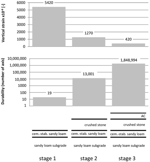 In order to assess the durability of the structure as a result of deformation of the subsoil, an analysis of various pavement structures made and operated in stages during construction was carried out. In the calculations, the FEM model was used, taking into account the appropriate layer arrangement depending on a given case. The calculations were carried out for the vehicle wheel load with a radius of 0.16 m and a pressure of 0.71 MPa, and the systems of elastic layers with the following modules: 10,000 MPa asphalt concrete; 400 MPa crushed stone; 250 MPa cement-stabilized soil (sandy loam); and 30 MPa native subgrade (sandy loam).