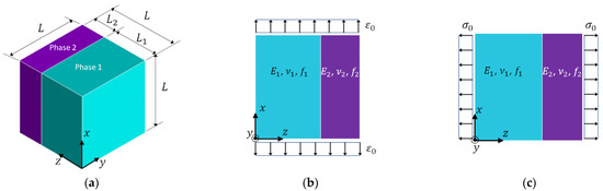 Figure A1 illustrates the iso-strain condition imposed on the composite RVE. Uniform tension or compression is applied at the top and the bottom surface, so that the phase materials experience the same strain () in the direction.