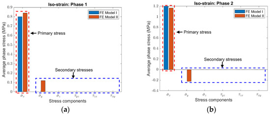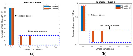 To compare stresses in the two finite element models, the average phase stresses are distinguished into primary stress and secondary stresses. The primary stress is the normal stress in the loading direction, while the secondary stresses include all the other stress components. It was found that the fundamental difference between FE Model I and II is that no secondary stress is introduced for FE Model I no matter it is the iso-strain or the iso-stress condition, while secondary normal stresses are always induced for FE Model II. It should be mentioned that, for FE Model II, if the IBC is applied in replacement of HBC, the secondary stresses would also include shear stresses. The HBC are used because they are consistent with those considered in the derivation of Equations (3a)–(3c) and (4a), (4b).