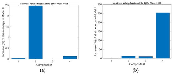 It was found that the total strain energy in FE Model II is always higher than that in FE Model I under the same conditions, no matter which composite and what volume fraction are simulated. The increases of strain energy in FE Model II compared with FE Model I in Composite #2 with a volume fraction of 0.35 are displayed in Figure 5, where the increase percentage is calculated as