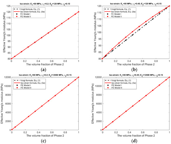 Under the iso-strain condition shown in Figure 1b, the effective Young’s modulus of the RVE in the (or ) direction is determined by the Voigt formula [1],