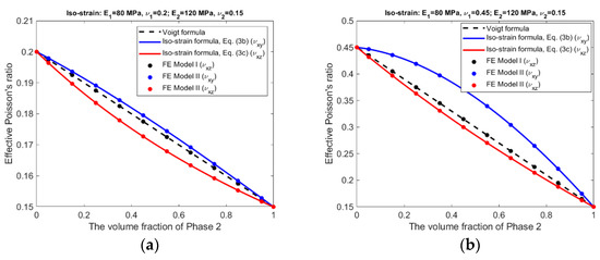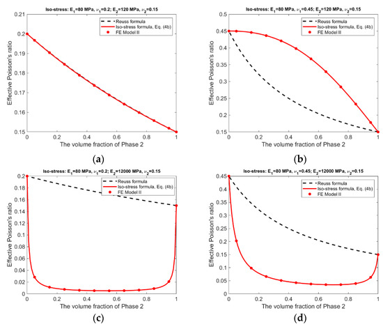 In general, the Voigt formula is more accurate than the Reuss formula for the prediction of effective Young’s modulus under the respective conditions; only if the composite has a large contrast in phase Poisson’s ratios and also has similar phase Young’s moduli, the Voigt formula has low accuracy, cf. Figure 6b. It appears that the influence from a large contrast of phase Poisson’s ratios can be ‘cancelled’ by a large contrast of phase Young’s moduli, comparing Figure 6b,d. On the other hand, the Reuss formulas is accurate only if the composite has a small contrast in both of its phase Young’s moduli and phase Poisson’s ratios, cf. Figure 8a. This is probably because the iso-stress condition is more stringent than the iso-strain condition. However, neither the Voigt nor the Reuss formula is accurate for the prediction of effective Poisson’s ratio. The newly derived counterparts of the Voigt and Reuss formulas, i.e., Equations (3a)–(3c) and (4a), (4b), are able to accurately predict effective Young’s modulus and effective Poisson’s ratio under the respective conditions, due to the consideration of the Poisson effect.
