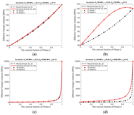 Iso-stress condition—Effective Young’s moduli predicted by analytical formulas and FEM. (a) Composite #1. (b) Composite #2. (c) Composite #3. (d) Composite #4.