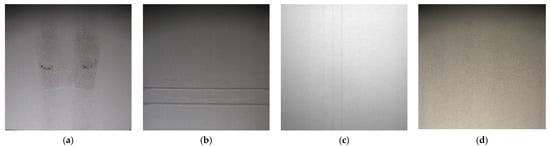 Three major pieces of equipment affect SLM processing: the laser beam, the metal powder, and the recoater. Improper parameters of the laser beam will cause residual thermal stress that further results in warping, deformation, or breaking of the workpiece. These situations result in the occurrence of several defects in the process of powder-spreading. The defects are defined as the powder uncover class. When powder spreading happens, some areas are defined as the powder uneven class because of the uneven powder coverage. The large defective powder uncover causes damage in the re-coater as a result of generating the vertical scratches. The scratches are grouped into the recoater scratch class. To sum up, three different types of defects are defined as the powder uncover, as shown in Figure 2a; the powder uneven, as shown in Figure 2b; and the recoater scratch, as shown in Figure 2c.