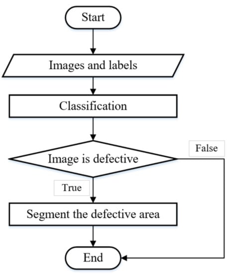 Two consecutive deep learning models are used to detect and locate several defects. The first stage is to determine whether the acquired images are with/without defects. One image without defect will be ignored (see Figure 2d); otherwise, it is further fed into the next stage to locate defects, so the three different types of defects can be located. The complete procedures are shown in Figure 3.