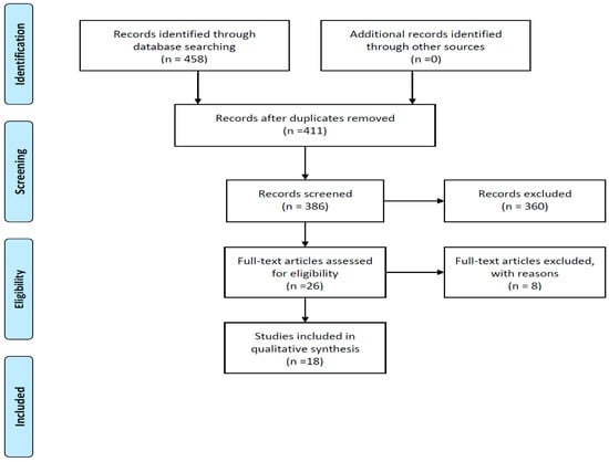 Four hundred and fifty-eight articles were identified and retrieved through the stipulated electronic databases searched (Figure 1). Using Mendeley to de-duplicate records, the titles of four hundred and eleven articles remained to be screened. Of the records that were screened, three hundred and sixty articles were excluded, as these did not meet the inclusion criteria. Only twenty-six full text articles met the prerequisite criteria according to their abstracts. After detailed evaluation of the full text articles using the study eligibility form created for this SR, the final number of included studies was eighteen, as eight were excluded, and reasons for their exclusion will be reported on (Figure 1).