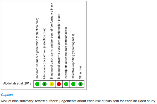 The only clinical study, a randomized clinical trial, was assessed using a risk of bias for clinical studies [11,18] (Figure 2). The six domains of the Risk of Bias tool as observed in Figure 2 indicated a recording of “high risk of bias” across one domain only, that of the blinding of the outcomes assessor and a recording of “unsure” of the blinding of both the participants and personnel who partook in the study. This does impact on the quality of parts of the research only. For all other domains, namely randomization (sequence generation and allocation concealment), incomplete outcomes data and selective reporting, and other types of biases, the assessment recorded a “low risk of bias”, as the required information was available in the article. The fact that for five categories, the study had a score of “low risk for bias” implies that the study was conducted well, and that most categories were reported showing good quality research. Thus, overall, the quality of the clinical trial seems acceptable.