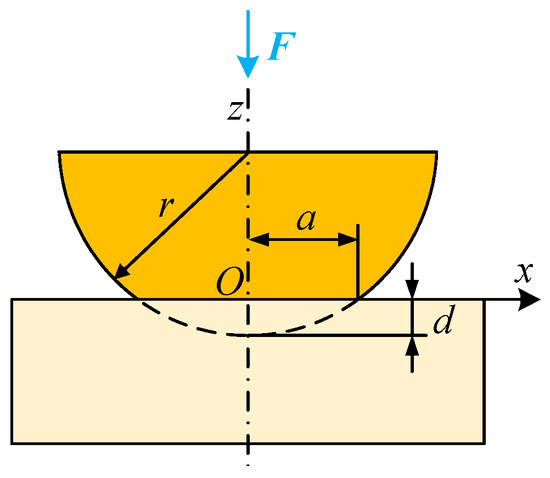 Traditionally, the mechanical contact between a cambered electrode and plane electrode was considered equivalent to the sphere–plane contact. The 2D contact model is described schematically in Figure 1. When the contact load force F is applied on the sphere with curvature radius r, the contact radius produced is a. The relationship between the load force F and contact radius a for elastic and plastic deformation can be written as [24]: