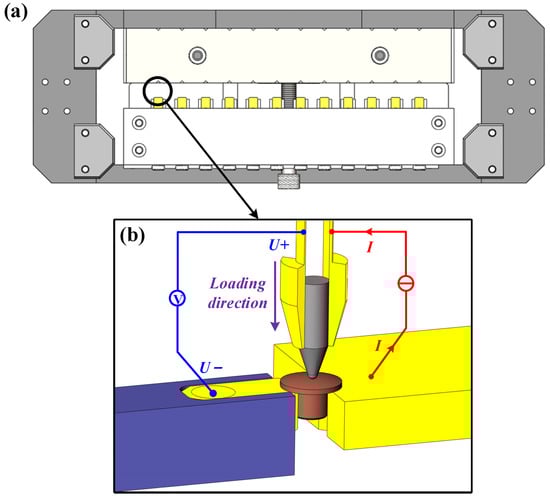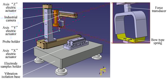 The test rig used in these experiments has been described in detail in [26]. We provide a brief summary here. The mechanical platform (shown in Figure 2) includes the 3D motion module, electrode clamping module and flexible loading module. Figure 3 schematically shows the four-wire measurement setup. The measurement resolution for contact resistance is 0.01 mΩ using the four-wire method.