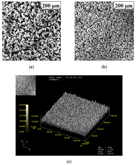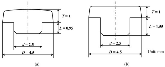 The selected electrode material was AgSnO2(12), and the applied additive was In2O3. The geometries of the movable sample and static sample are shown in Figure 4. Two representative AgSnO2(12) electrodes with different surface topographies were selected to investigate the electrical contact characteristics. The surface topographies of the bright electrode and the matt electrode with a scanning area of 1280 × 1280 μm2 are shown in Figure 5. The values for the measured parameter Sq (root mean square height), which represents the height fluctuation of each point in the concerned region relative to the mean height, were 27.87 μm and 28.64 μm for the bright electrode and matt electrode, respectively. The measured hardness of the AgSnO2(12) material was 73.7HV(0.1 N) and the electrical resistivity was 2.35 × 10−8 Ω·m. The details of the experimental conditions are listed in Table 1. It can be noted that the contact force between two matched AgSnO2 contacts is always lower than 5 N in practical low-current-switching devices. Thus, the final load force in the series of experiments was set to 5 N to simulate real working conditions.