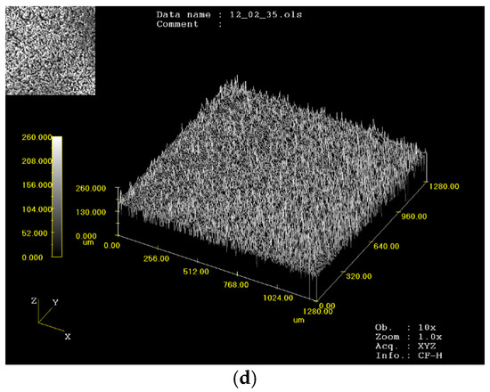 The laser confocal pictures for the bright and matt electrodes. (a) The surface topography of the bright electrode. (b) The surface topography of the matt electrode. (c) The surface wireframe of the bright electrode. (d) The surface wireframe of the matt electrode.