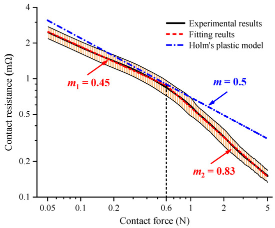 where Rce is the contact resistance for the elastic deformation situation with the coefficient , and Rcp is the contact resistance for the plastic deformation situation with the coefficient . It can be noted that the contact resistance and load force follow the power correlation according to Equations (4) and (5). The power exponents are −0.33 and −0.5, individually, for the elastic and plastic deformations.