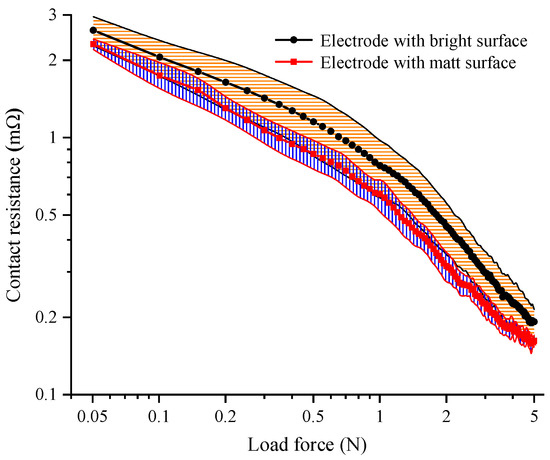 The variations in the average values and error bands of the measured contact resistances for the bright and matt AgSnO2(12) electrodes as functions of the load force for an electrical current of 10 mA are plotted for comparison in Figure 7. Each contact resistance curve was calculated statistically from 20 group tests on different electrode samples with bright or matt surfaces. As can be seen, the average value of the contact resistance for the matt electrode material was always lower than that of the bright one. The average value and standard deviation for the contact resistance of samples with bright and matt surfaces were 0.192 ± 0.098 mΩ and 0.162 ± 0.008 mΩ for a load force of 5 N, respectively. The contact resistance of the matt electrode decreased by 18.52% compared with that of the bright electrode, which indicates that the matt electrode surface could effectively produce low and stable contact resistance when the load force was set.