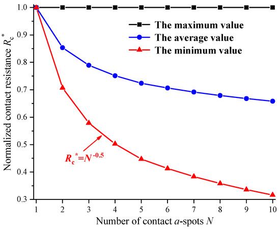 When the area of one contact a-spot approaches S for N contact a-spots, the contact resistance is mainly determined by this contact a-spot and reaches the maximum value. Moreover, it was found that the average and minimum values of the normalized contact resistance decreased nonlinearly when the number of contact a-spots increased. When the number of contact a-spots was smaller than 5, the average value of the normalized contact resistance decreased sharply (as shown in Figure 9). The contact resistance always showed an obvious decrement when the number of contact a-spots increased one by one (as shown in Figure 10). After that, the variation rate for the normalized contact resistance became slower for the same load force. In addition, the total contact resistance reached the minimum value and always decreased rapidly with an exponential power of −0.5 as the number of contact a-spots increased when the area of each a-spot was kept equal. This means that the contact resistance was determined by the number of contact a-spots for a fixed contact area when the number of contact a-spots was relatively smaller. The contact resistance could further drop to the minimum value when the contact area was distributed equally across each contact a-spot.