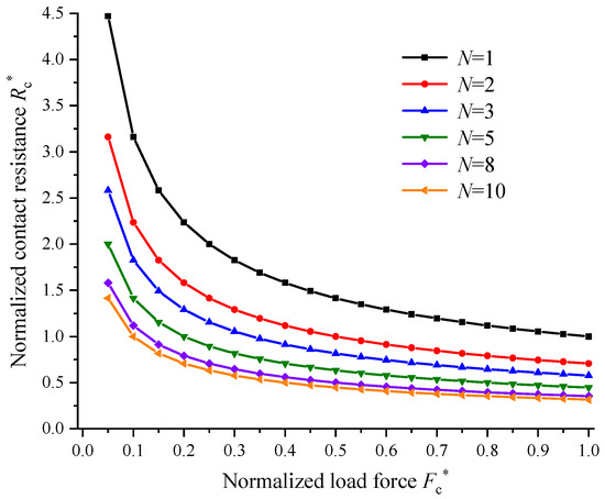 As can be seen, the normalized contact resistance depends closely on the contact area or load force of each contact a-spot for the same total contact area or load force. For the case of N = 2, there are two contact a-spots and the contact areas are defined as S1 and S2, respectively. It can be assumed that the initial contact areas of the two contact a-spots are S1 = 0.01S and S2 = S – S1 = 0.99S. Then, the contact area S1 increases in steps of 0.01S until S1 reaches up to 0.5S. Thus, the normalized contact resistance with various combinations of contact area for two contact a-spots could be calculated with Equation (8). Similarly, the normalized contact resistance when the number of contact a-spots increases from N = 3 to N = 10 can also be calculated. The variations in the minimum, average and maximum normalized contact resistance Rc* as a function of the number of contact a-spots were further extracted and are plotted in Figure 9. The variations in the normalized contact resistance Rc* with the same area for each a-spot calculated by Equation (9) as a function of the normalized load force F* with a varying number of contact a-spots are plotted in Figure 10.