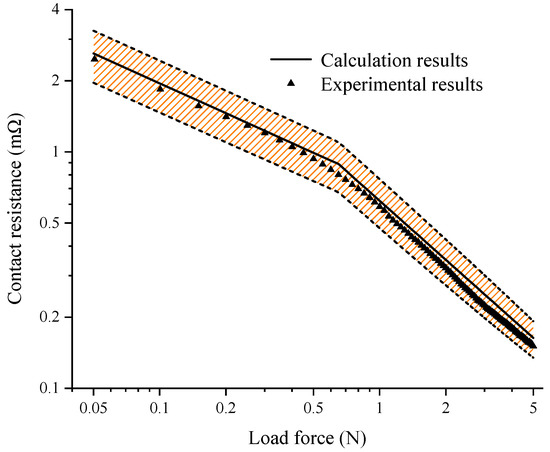 The fitting coefficient b of the bright surface was about twice that of the matt surface. This meant that the fluctuation range of the contact resistance for the bright surface was larger. A new AgSnO2(12) contact with a bright surface, which was excluded from the same batch of the experimental samples used to build the calculation model, was selected to verify the accuracy of the presented corrected model of contact resistance. The variations in the calculation results for the contact resistance with the error band using Equations (11) and (12) and the experimental results as a function of the load force are plotted in Figure 11. The maximum deviation between the average value of the contact resistance and the experimental results was only 4.5% with the load force of 0.6 N. The comparison results indicated that the calculation results for the contact resistance were always in agreement with the experimental results.