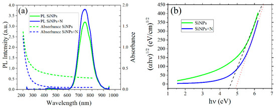 As shown in Figure 2a, the sample with SiNPs exhibited a typical PL spectrum in the red region of the visible spectrum. The PL peak for the SiNPs sample occurred at 739 nm, and it ranged from 600 nm to 900 nm. The comparison of the PL spectra for the SiNPs and SiNPs+N samples can be easily visualized in Figure 2a, the PL data have similar spectral characteristics in both cases, but the PL intensity was almost 27% stronger in the case of SiNPs+N. The optical absorption spectra for the SiNPs and SiNPs+N samples are also shown in Figure 2a, and both spectra exhibited the typical absorption edge towards the UV. Figure 2b shows the Tauc plots to find an estimation of the average bandgap of the samples.