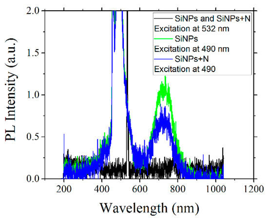 Photoluminescence spectra for the SiNPs and SiNPs+N sample by using two different excitation wavelengths: 490 nm (blue and green plots) and 532 nm (black plot).