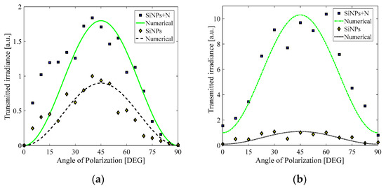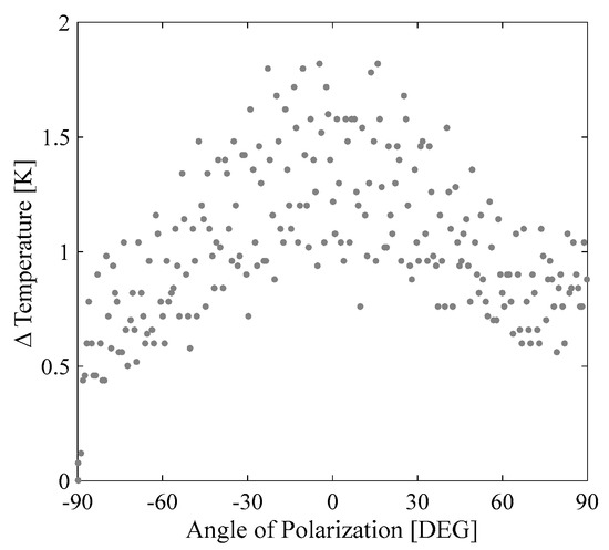 Change in temperature (ΔT) vs. angle of polarization of the incident beams in a two−wave mixing experiment in the SiNPs+N sample irradiated by nanosecond pulses at 532 nm.