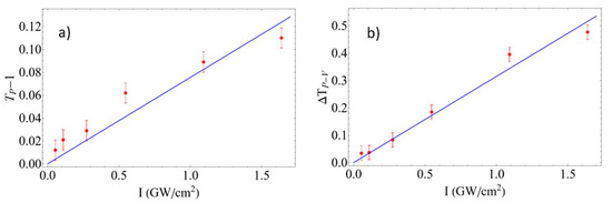 Measurements were made at different input irradiance values in order to verify whether we have a purely χ(3) nonlinearity or not. For this purpose, in the case of the open-aperture z-scan results, we plot the maximum transmittance change obtained, which we label as Tp−1, the difference between the peak transmittance at the focal plane minus the linear transmittance (obtained far from focus), which is normalized to 1. Figure 7a shows the Tp−1 values extracted from each data set at a given input irradiance I0, as a function of I0. The results clearly show a linear relationship, which indicates that we have a purely third-order nonlinearity up to the highest irradiance employed in the experiments. The nonlinear absorption coefficient beta can be extracted from the slope of a linear fit to the data, yielding β = −3.97 ± 0.01 × 104 cm/GW. Figure 7b shows the same analysis applied now to the input irradiance dependence of the closed-aperture results. In this case, the plot shows the peak to valley transmittance change ΔTpv obtained for each I0 value. The results show again a linear dependence of ΔTpv with I0 implying a purely χ(3) nonlinearity. A fit to the data allows the extraction of the nonlinear refractive index to yield n2 = 0.26 ± 0.01 cm2/GW.