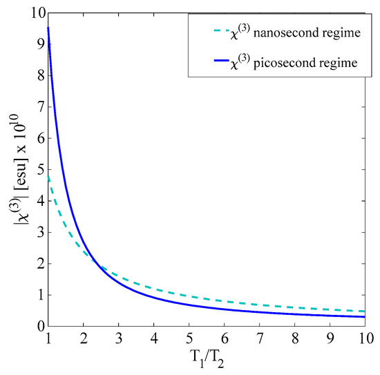 The modification in the bandgap produced by N doping can change the resonance conditions through changes in the detuning factor Δ, and eventually, the population losses are suitable to enhance the third-order optical nonlinear properties in different proportions for nanosecond and picosecond pulses. However, for a non-resonant interaction as the studied case, the radiative, spontaneous emission, and the decay given by phonons can be enhanced by the incorporation of defects in the nanocomposites. This off-resonance condition is estimated to be dominant for the change in the nonlinear behavior as a function of the rate of loss factor T1/T2 in both ns and ps temporal regimes, as illustrated in Figure 5. It is worth mentioning that the modification in Eg changes the nonlinear response, but the different rates of the loss factor T1/T2 for ns and ps pulses can produce results like those exemplified in Figure 8.