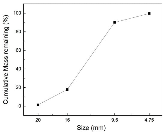 In this study, 42.5R ordinary Portland cement from the brand E’sheng, which was blended with low-calcium fly ash, was adopted as the cementitious materials, and the weight ratio of the cement to fly ash was 4:1. The type of cement and fly ash used in this study was the same as we used in our previous study [24], and the chemical composition, determined with energy disperse spectroscopy (EDS), is shown in Table 1. Local river sand around Chengdu was used as the fine aggregate. The coarse aggregates were acquired from local gravel in the size range of 4.75 to 20 mm, and the grain size distribution of the coarse aggregate is shown in Figure 1. To reduce the water consumption, a powdery polycarboxylic superplasticizer (S.P) was added with a dosage of 0.3 wt% of the cementitious materials. The water to cementitious material ratio was 0.29. The mixture proportions of the fresh concrete are shown in Table 2.
