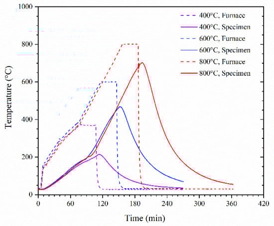 To acquire the temperature history of the specimens during high-temperature exposure, a type-K thermocouple with a diameter of 4 mm was placed in the middle of one specimen which was exposed to each temperature. The thermocouples were added to the specimens after 28 days of curing. A hole with a diameter of 6 mm, which was 50 mm deep, was drilled into the specimen from the middle of one of the surfaces. After adding the thermocouples, the holes were filled with the same mortar and continued curing until the time of the high-temperature exposure. During the high-temperature exposure, the thermocouples were linked to the computer through a data exchange device, which enabled us to acquire the temperature data every 7 s. The development of the temperature of the furnaces and the specimens is shown in Figure 2.