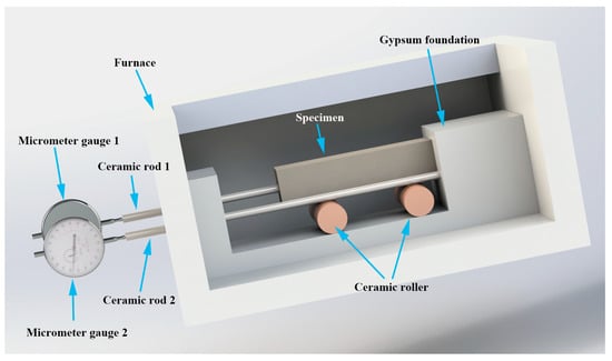 The device consisted of a gypsum foundation, two ceramic rollers, two ceramic rods, and two micrometer gauges. When testing the thermal expansion of the specimen, the gypsum foundation, ceramic rollers, and specimens were placed in the furnace, the micrometer gauges were immobilized outside the furnace, and the ceramic rods were inserted into the furnace with the other ends connected to the micrometer gauges, as shown in Figure 3.