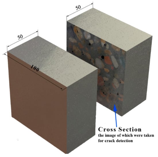 The macro-cracks inside the concrete were identified by analyzing the images of the cross-sections of the specimens. To acquire the images of the cross-sections, the 28-day-cured specimens were cut with a concrete cutting machine, as shown in Figure 4. During cutting, the blade of the machine was cooled with flowing water to avoid further damage to the specimens. Then, the two parts of a specimen were recombined using the same mortar along the edge of the curing surfaces, and the curing continued until the high-temperature exposure was achieved. After the exposure and post-fire curing, the images of the cross-sections were taken with a digital camara. Since the images for the crack detection and analysis were taken using the same cross-section before and after the post-fire curing, the results were more comparable than those from our previous study [19].