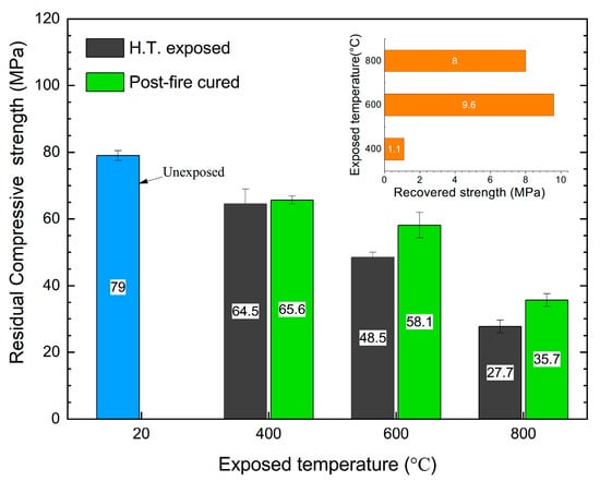 Figure 6. Residual compressive strength of the specimens after high-temperature exposure and post-fire curing.
