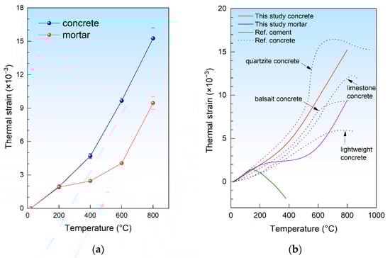As shown in Figure 7a, for both the concrete and mortar, the thermal strain increased with the temperature. The thermal strain of the concrete and mortar was almost the same at 200 °C, but that of concrete was obviously higher than the mortar after 200 °C, which correlates with the results reported by Schneider [26] in 1988. At a temperature higher than 200 °C, because of the higher coefficient of the thermal expansion (CTE) of the concrete [27], the thermal strain of the concrete increased more with the increasing temperature than the mortar. From Figure 7a, it is easily observed that the thermal strain of the concrete increased with a similar rate at 400 °C as at 200 °C, and it kept increasing at 600 °C and 800 °C with a higher rate. Moreover, the increase rate at 600 °C and 800 °C seemed to be unchanged. Comparatively, for the mortar, the thermal strain increased differently from that of the concrete. With a similar increase rate to that of the concrete at 200 °C, the increase rate of mortar obviously dropped at 400 °C, rose at 600 °C, and reached the same level as that of the concrete at 800 °C.