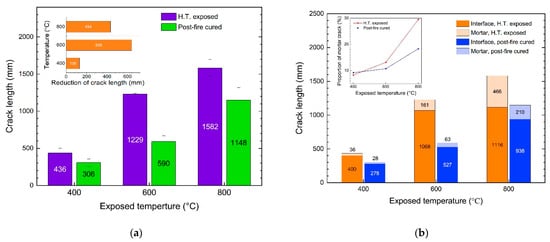 To discover the behavioral differences between the interfacial and mortar cracks, the lengths of the two different types of cracks were calculated, as described in Section 3. As shown in Figure 8b, the length of the interfacial crack was 400 mm after being exposed to 400 °C, and the length increased to 1068 mm and 1116 mm for those cracks exposed to 600 °C and 800 °C, respectively. For the specimens exposed to 400 °C, the length of the mortar crack was 36 mm, and the lengths were 161 mm and 466 mm for those exposed to 600 °C and 800 °C. Although the lengths of both the interfacial and mortar cracks increased with the increasing exposed temperature, the greatest increase in the two types of cracks occurred at different temperatures. For the interfacial cracks, from 400 °C to 600 °C, the length increased from 400 mm to 1068 mm with a 668 mm increment, and just a 48 mm increment from 600 °C to 800 °C. Comparatively, for the mortar crack, the largest increment occurred from 600 °C to 800 °C, increasing from 161 mm to 466 mm.