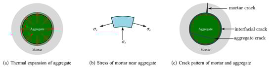 As shown in Figure 7a, at a temperature higher than 200 °C, the thermal strains of mortar and concrete were quite different. At a temperature higher than 200 °C, the thermal expansion of the concrete was higher than that of the mortar. Consequently, cracks were induced in the mortar during high-temperature exposure and remained after cooling down. At a higher temperature, the differences in the thermal strain between the concrete and mortar became larger, as shown in Figure 7a. The expansion of the aggregate was constrained by the mortar around it, as shown in Figure 9a; consequently, tensile stress was induced in the mortar, as shown in Figure 9b. Meanwhile, compressive stress was induced in the aggregate. With the temperature rose, the tensile stress increased, and cracks were induced in the mortar, and the compressive stress induced cracks in the aggregate, as shown in Figure 9c. After cooling down, the aggregate shrunk while, because of the cracks in the mortar, the mortar around the aggregate was not able to shrink with the aggregate; thus, cracks were induced at the interface of aggregate and mortar, which are named interfacial cracks.