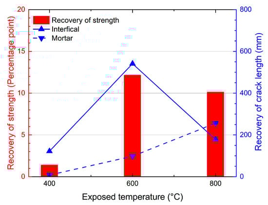 However, the relationship between the recovery of the crack and the recovery of the compressive strength indicates that the recovery of interfacial cracks is more related to the recovery of the strength at 400 °C and 600 °C, as shown in Figure 10. In our previous study [23], it was found that the recovery of strength after post-fire-curing mainly resulted from the recovery of mortar-aggregate interfacial cracks. With the results from the previous study and this study taken together, it can be concluded that the recovery of the strength mainly results from the recovery of the interfacial strength, which is specific to the recovery of an interfacial crack. Moreover, at 800 °C, the recovery of mortar cracks is obvious, which also benefits the recovery of the concrete strength.