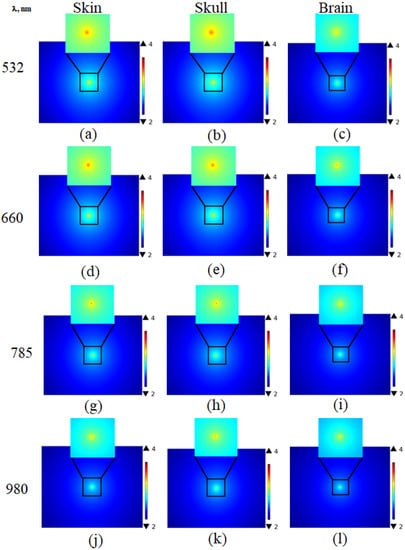 - Salehpour, F.; Cassano, P.; Rouhi, N.; Hamblin, M.R.; De Taboada, L.; Farajdokht, F.; Mahmoudi, J. Penetration Profiles of Visible and Near-Infrared Lasers and Light-Emitting Diode Light through the Head Tissues in Animal and Human Species: A Review of Literature. Photobiomodulation Photomed. Laser Surg. 2019, 37, 581–595. [Google Scholar] [CrossRef]