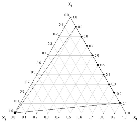 Considering that for binary mixtures, the complementarity of the mole fractions is verified, then , and knowing that etc., Equation (2) will have the following form: