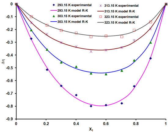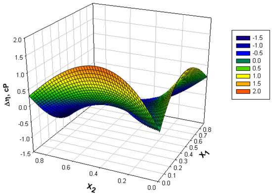 The deviation from the ideal behavior is highlighted by the viscosity deviation (Δη) (Figure 2), defined by relation (8):