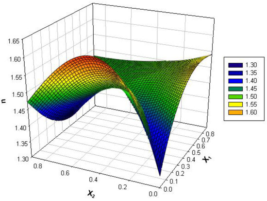In previous studies [18,19,36], it was demonstrated that good results were obtained for the correlation of excess thermodynamic properties with normalized temperature, refractive index, and mole fractions, with the help of models obtained by the multiple linear regression method.