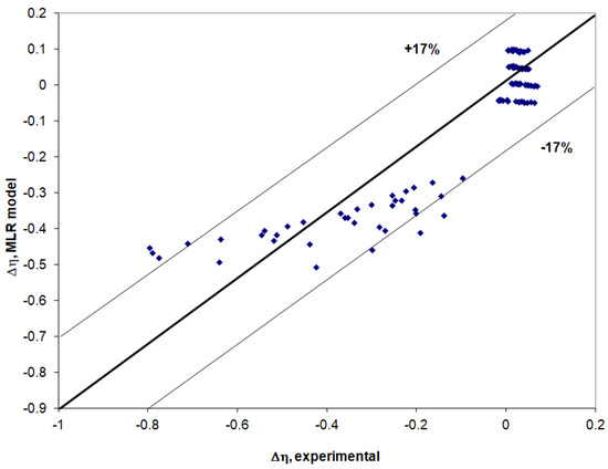 Viscosity deviation calculated with the (MLR) proposed model (Equation (9)) compared to experimental values.