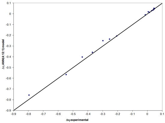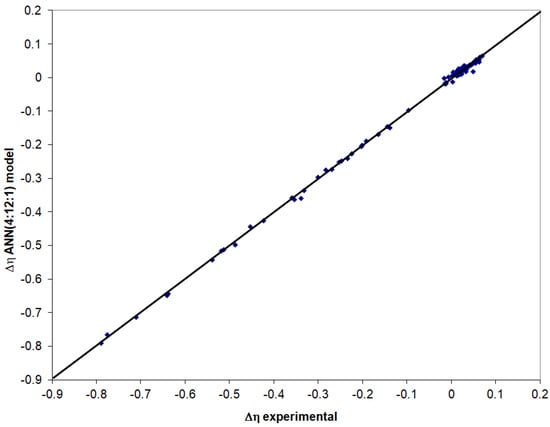 For the neural model validation stage, 15 series of experimental data were used. According to the representation in Figure 7, very good results are obtained, and the values calculated with the ANN(4:12:1) model for the viscosity deviation are very close to the experimental values. The standard deviation in this step of neural model validation is 0.0226, and the correlation coefficient is 0.996.