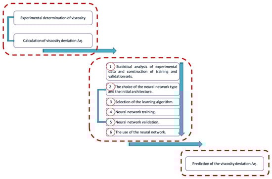 Artificial neural networks have been used by Mehlman et al. to make density, viscosity, and refractive index predictions for ternary and quaternary solvent mixtures using experimental determinations of the properties of binary systems [20]. Rocabruno-Valdés et al. made predictions of the dynamic density and viscosity of biodiesel from fatty acid methyl esters composition, number of carbon atoms, number of hydrogen atoms, and temperature, using single-layer neural networks with 1 to 6 hidden neurons. In the validation stage, the performance of the built models was very good, and when comparing the experimental values with the simulated ones, the correlation coefficients were higher than 0.92, and the mean squared error (MSE) was higher than 0.0018 [21]. Correlation coefficients of 0.98 and the average absolute relative deviation on the test set of 6.84% were recently obtained by Yu et al. with a multilayer perceptron neural model for predicting the viscosity of an emerging class of green solvents [22]. Other existing studies in the literature used neural networks to predict the viscosity of mixtures containing ionic liquids [23,24] or nanofluids [25]. The use of artificial neural networks for viscosity deviation modeling is less studied in the literature.