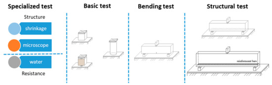 This section deals with the evaluation of the basic mechanical properties of fiber-reinforced concrete. The mechanical properties selected for study were the compressive strength, split tensile strength, and modulus of elasticity. A cube of nominal size 150 mm × 150 mm × 150 mm was chosen for compressive strength [30] and split tensile tests [32]. The modulus of elasticity was tested for cylindrical samples with only plain concrete for reference [33]. The test scheme used for the testing of basic mechanical properties and bending tests is shown in Figure 4.